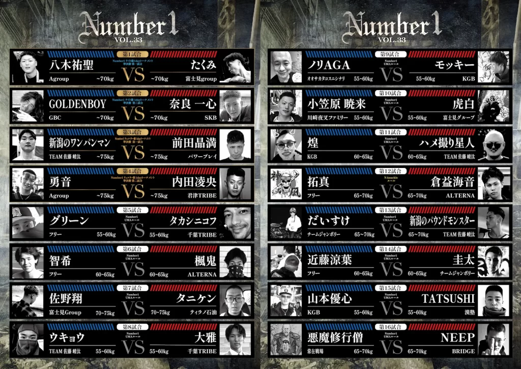 | Number1 VOL.33 @君津アクアスタジオ 全28試合の対戦カード(変更になる場合があります) | ||||||||