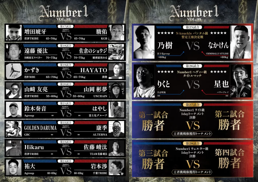 | 第28試合 | – | 第三試合勝者 | ~75kg | 第四試合勝者 | – | Number1 ウェルター級 1dayトーナメント 決勝 〈王者挑戦権獲得トーナメント〉 | ||